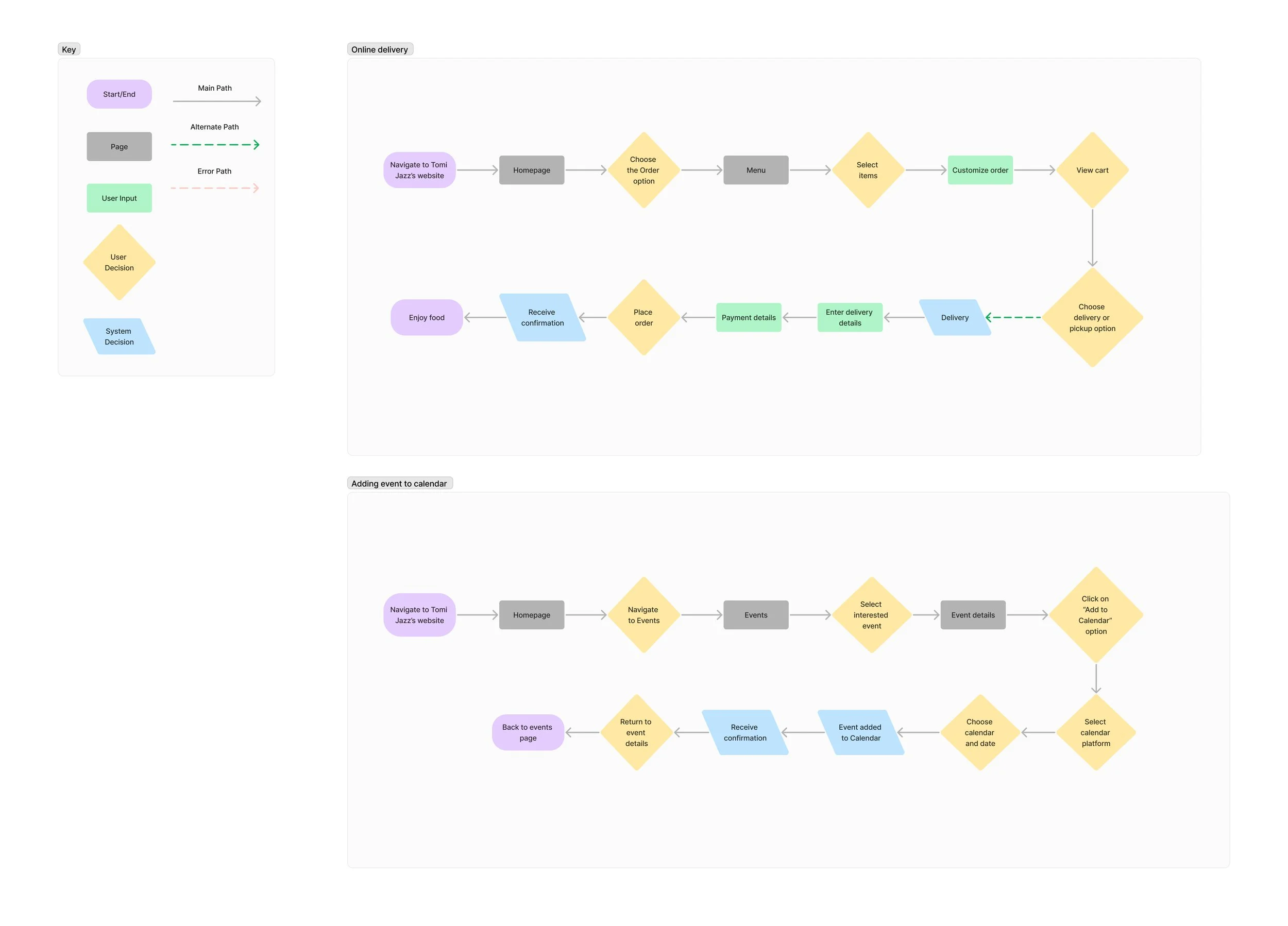 To translate research insights into structure, I created low-fidelity wireframes that mapped out the redesigned Tomi Jazz website.